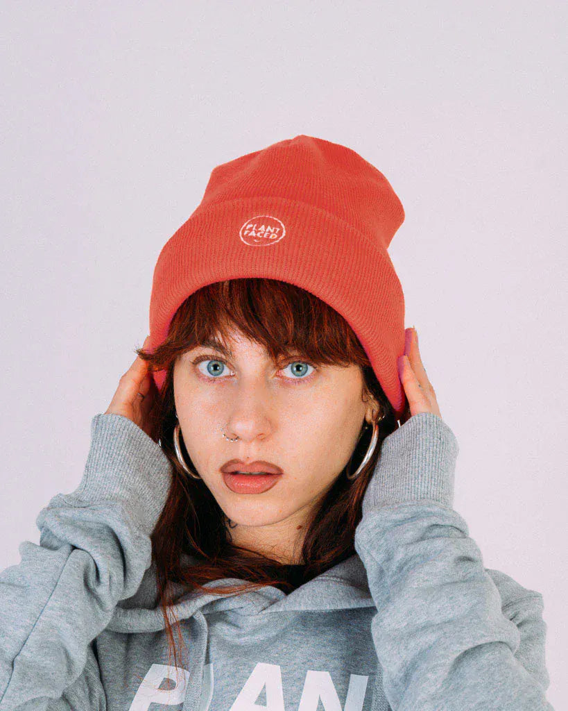 Stay cosy and cruelty-free with our Plant Faced Beanie in a sweet Coral hue.