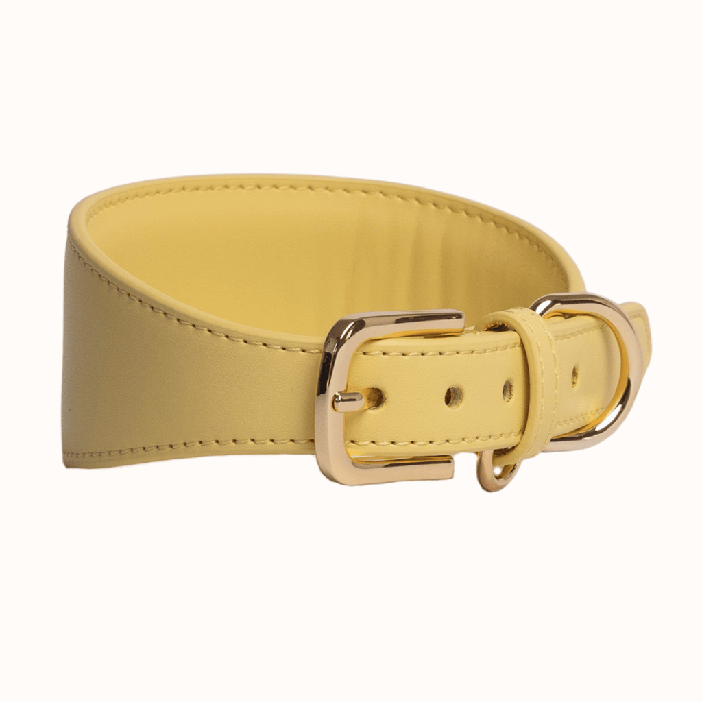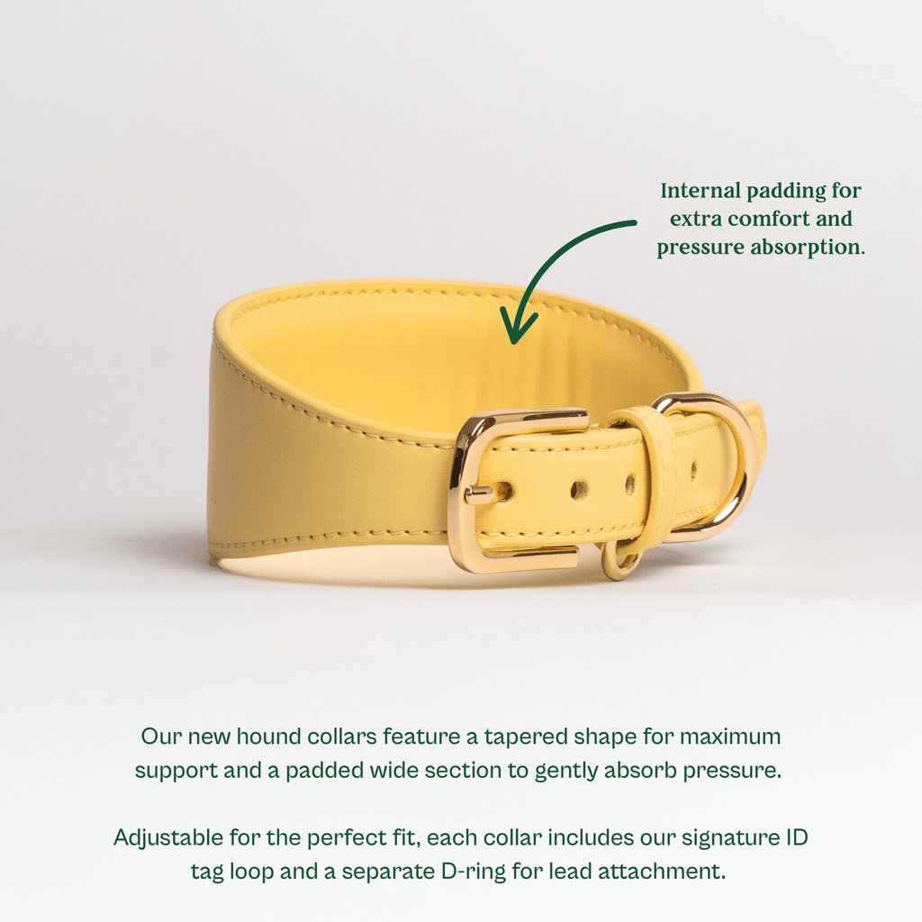 A beautiful and bold British design, crafted from smooth, butter yellow vegan leather and elegantly finished with gold hardware and a subtle debossed logo. Our hound collars are padded on the wider part to offer optimum support to the most delicate necks.
