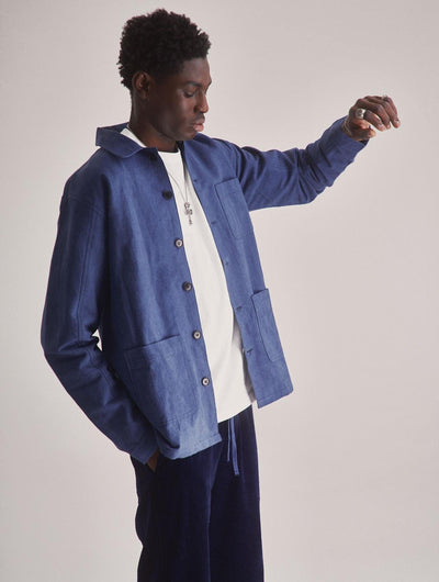 The men's Railway jacket combines the natural strength of 60% cotton and 40% hemp in a handwoven fabric that’s both breathable and sturdy. Fully lined with 100% cotton for comfort, it is fully vegan and features vegan corozo buttons. Carefully hand loomed, Its deep blue shade makes it an excellent layering piece for autumn, offering warmth without weight. Choose a jacket that blends timeless craftsmanship with everyday practicality.