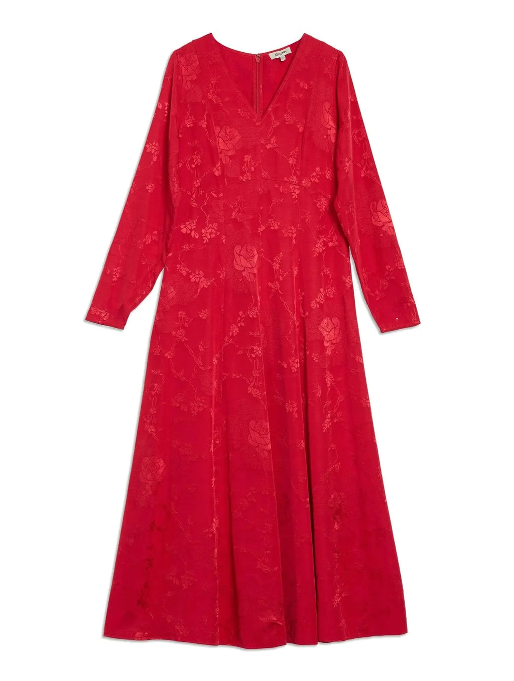 This elegant midi dress is crafted from a deep red floral jacquard fabric.
