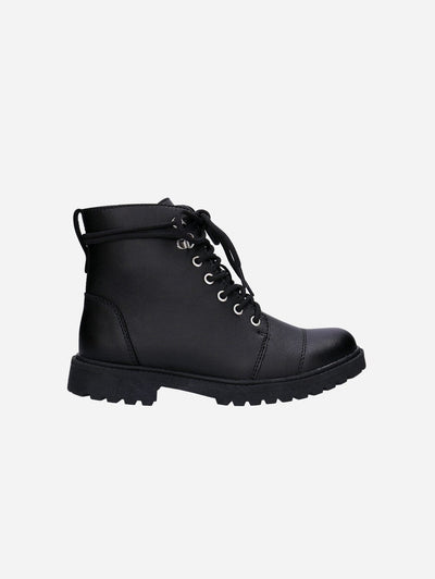 They look kind of rock-biker style, and are closed by a lateral zipper and secure lacing around the ankle into D-ring eyelets, along with the pull-loop that helps to fasten. Robust and adjustable, with cap toe and edge reinforcement sewn, they also have a slip-resistant ridged sole and the logo engraved on the tongue.