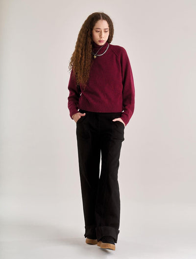 The ROSE Organic Cotton Trouser in black blends comfort and conscious design. Made from 75% organic cotton with a touch of spandex for ease of movement, these mid-rise trousers feature a wide leg with subtle flare created by side seam splits. Details like corozo buttons and a metal zip fly add natural, durable accents, while panelling and fixed turn-ups enhance the relaxed fit. Produced in a SEDEX audited factory and fully vegan, these trousers offer a mindful choice for everyday wear, combining ethical values with effortless style.