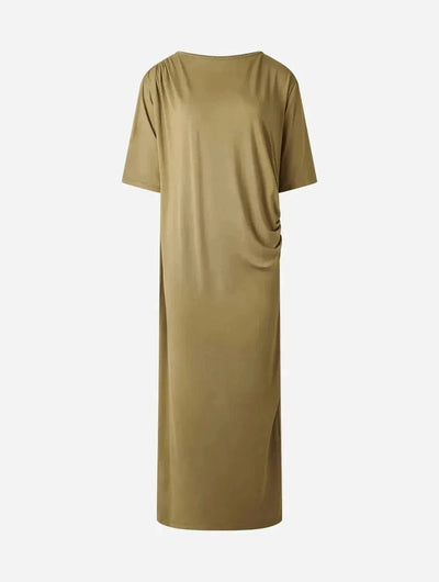 The SAHARA Modal Dress in Olive blends 95% modal with 5% spandex for a super soft, comfortable fit that moves with you. Ethically crafted in a SEDEX-audited factory and marked with a Lenzing-certified swingtag, this vegan dress pairs style with responsibility. Subtle ruching at the neck and waist creates a flattering drape, while the ankle-length cut and wide elbow-length sleeves offer a breezy, relaxed silhouette. A thoughtful choice for those seeking versatile, eco-friendly fashion with effortless charm.