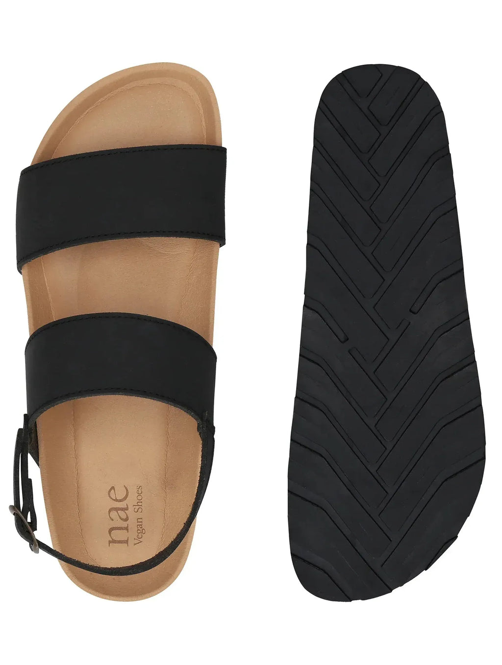 Savai Black is a minimalist vegan sandal made in Spain, designed for everyday comfort and conscious living. Crafted with a vegan nubuck-like upper, a natural cork insole, and a durable outsole made from recycled car tyres, it offers stability, softness, and long-lasting wear. Featuring two front straps and a back strap with buckle closure, Savai provides a secure fit with a clean, timeless silhouette.