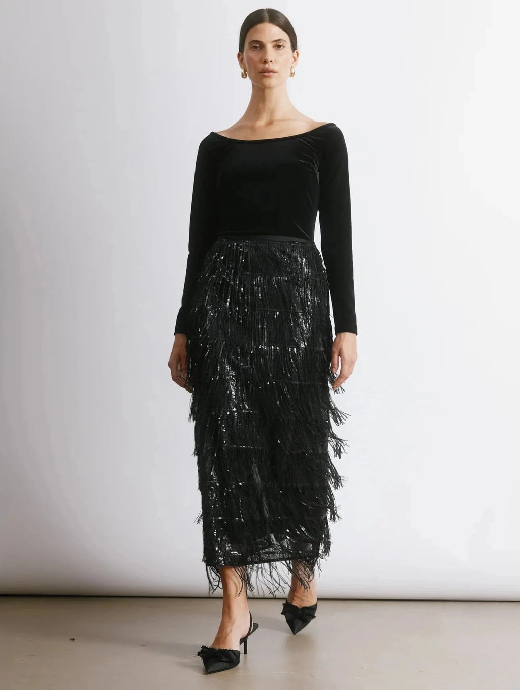 Elevate your style with this stunning midi skirt, featuring rows of sequin fringe that catch the light beautifully. Designed with a comfortable mesh lining, it ensures both glamour and ease for any occasion.