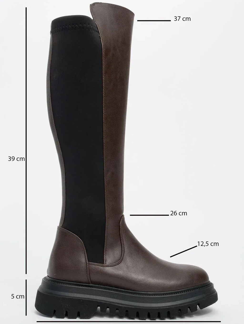 A sleek over-the-knee boot with a faux-leather and stretch fabric upper, featuring a comfortable block heel for all-day wear. 2.0" heel, 15.4" shaft (size 7US) 10.2" circumference (size 7US); slip-on design with stretch panel