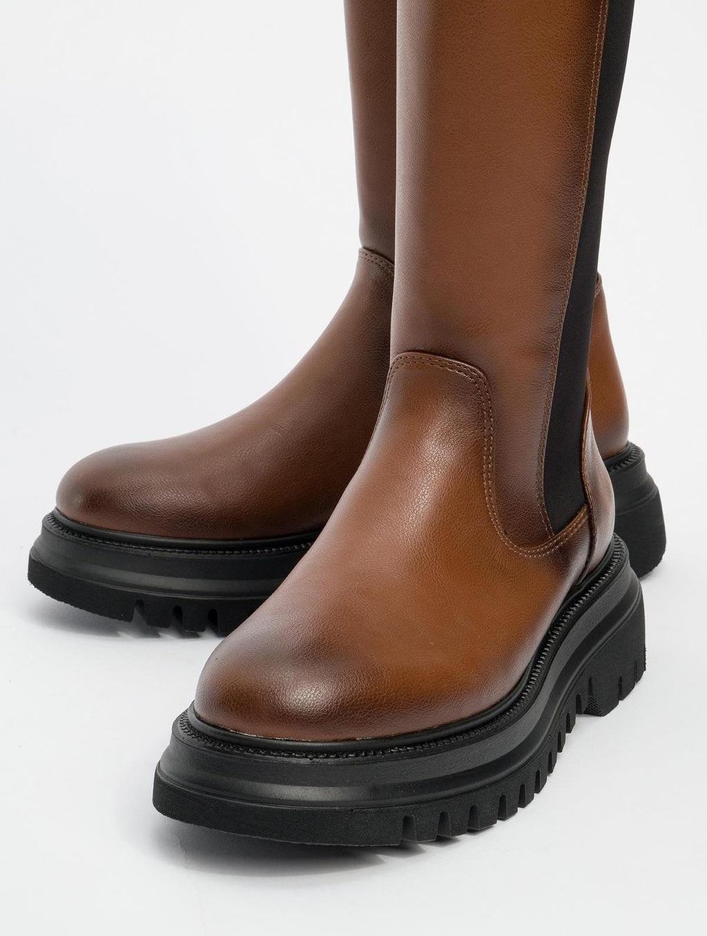 A sleek over-the-knee boot with a faux-leather and stretch fabric upper, featuring a comfortable block heel for all-day wear. 2.0" heel, 15.4" shaft (size 7US) 10.2" circumference (size 7US); slip-on design with stretch panel