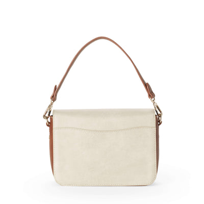 Classic two-tone satchel with adjustable crossbody strap included. Flap with magnetic snap closure. interior zip and pouch pockets.