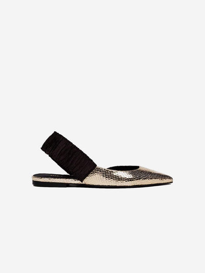 Pointed-toe ballerinas. Open at the back, with a wide black satin elastic.