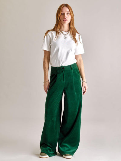 The SOFIA Velvet Trouser in green combines sustainable materials and effortless style. Made from 80% organic cotton and 20% recycled polyester, this vegan-friendly trouser is crafted in a Sedex-audited factory. Its winter-weight velvet offers a soft, fluid drape, while the mid-to-high rise and oversized slouchy silhouette provide comfort and a flattering fit. Featuring a metal zip fly, branded corozo button, and practical back flap pockets, these trousers bring relaxed elegance to your seasonal wardrobe.