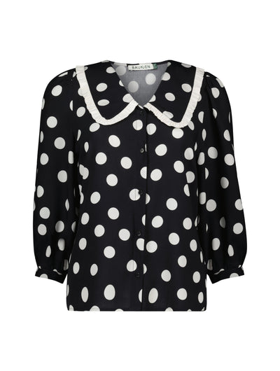 Polka dots, a statement collar plus a frill: what more could you want from a blouse?! The Sosha is the ultimate outfit pick-me-up, promising to inject a touch of newness to your favourite trousers and jeans. Dress it up for dinner with drop earrings, or style its playful collar over a cardigan.