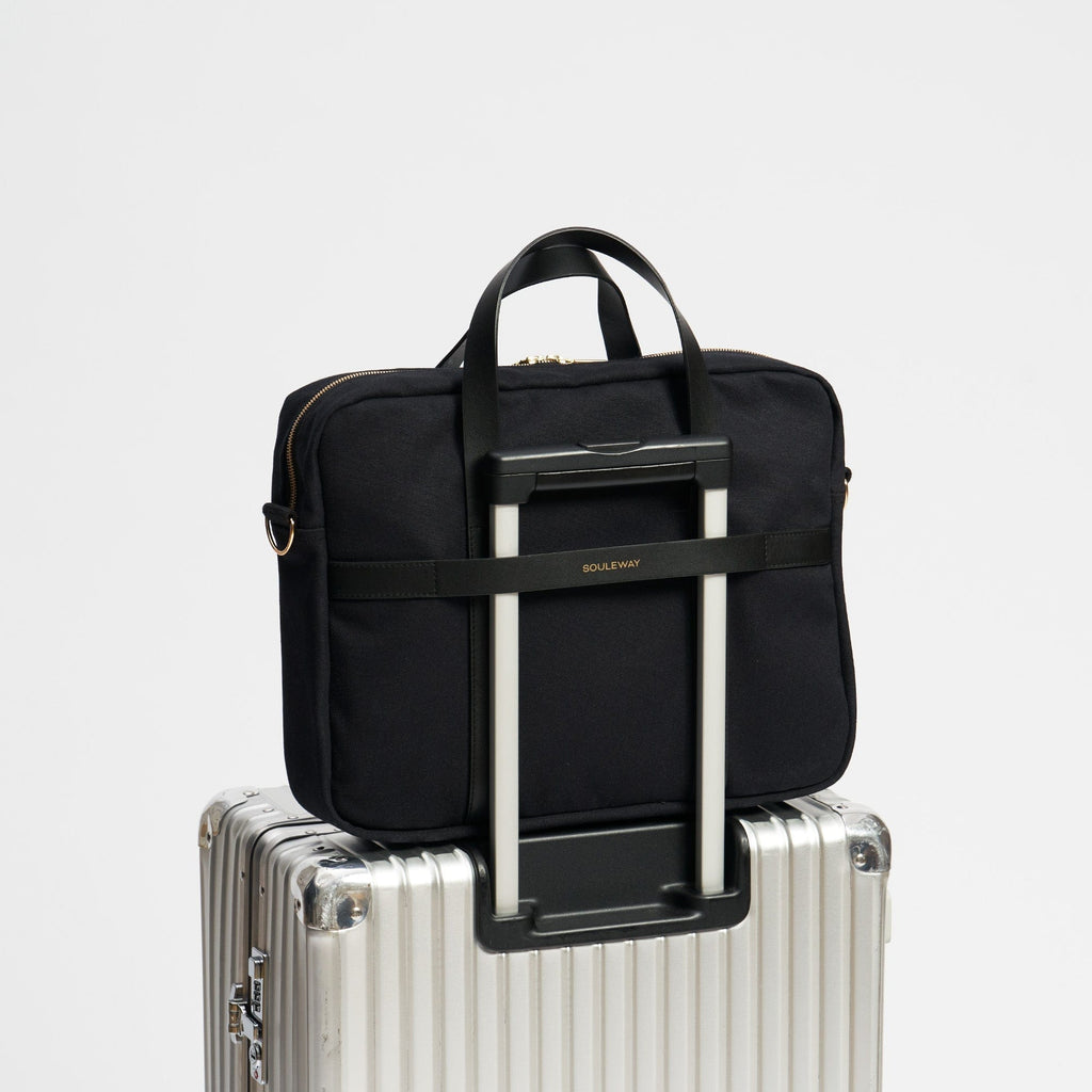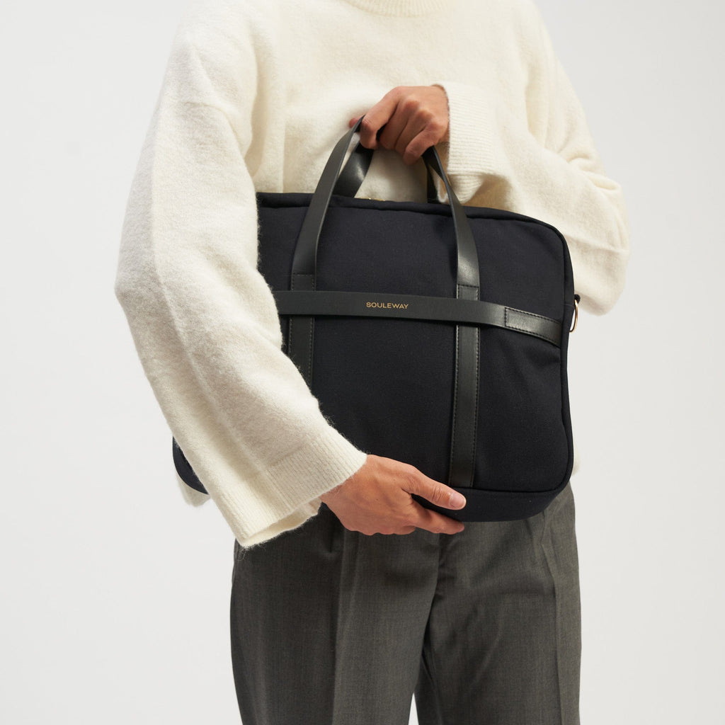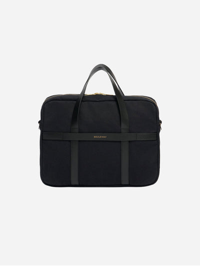 The laptop bag is made from water-repellent canvas fabric and the vegan leather alternative Oleatex. It is characterised by clear lines and high-quality workmanship. The laptop bag has space for up to two 16'' laptops and other items you need for everyday work or university life. The bag can be carried by hand or over the shoulder using the detachable cotton strap.