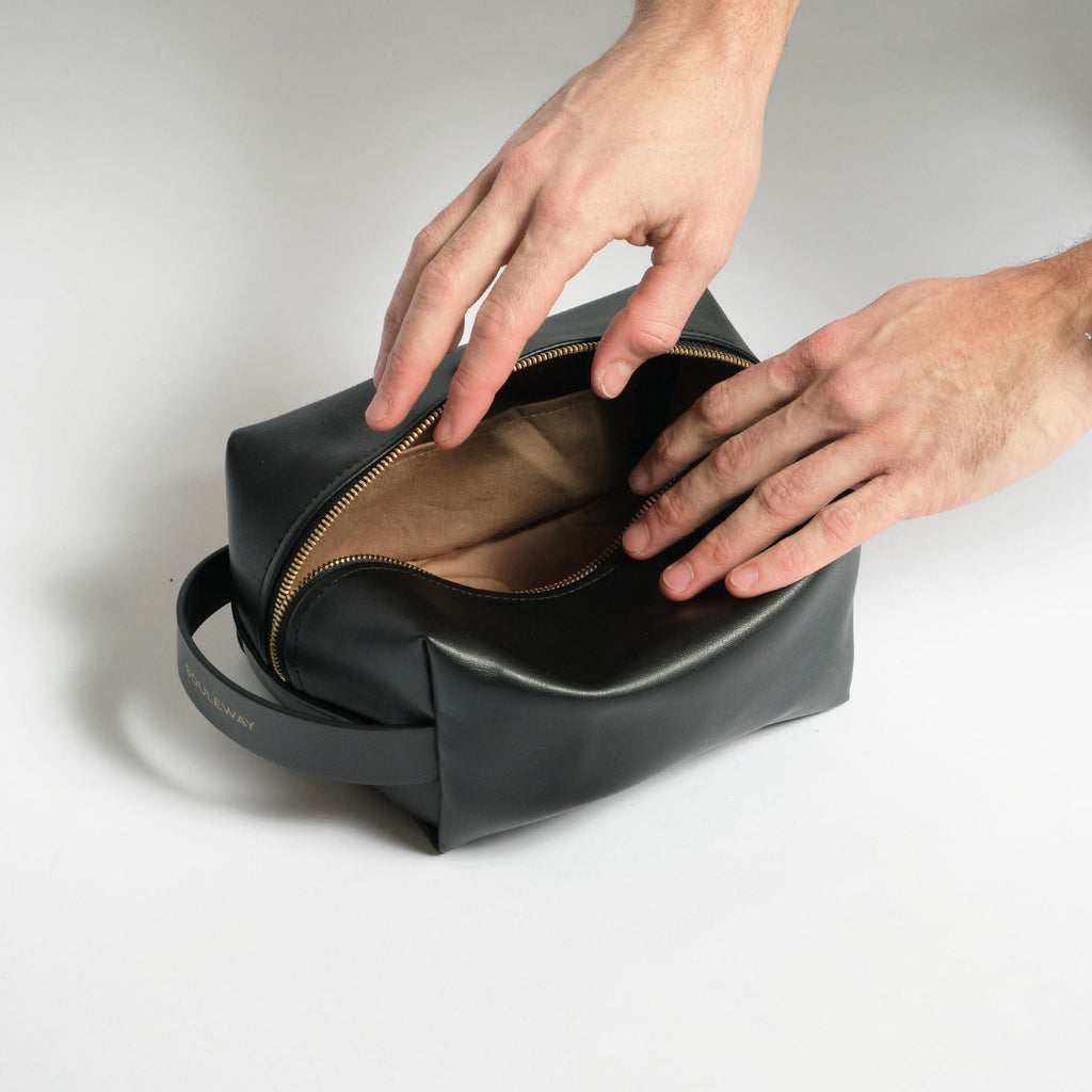 This small toiletry bag is made from the vegan leather alternative Oleatex. With its high-quality finish and minimalist Souleway look, this washbag is a reliable companion on every journey. The bag has three open compartments inside.