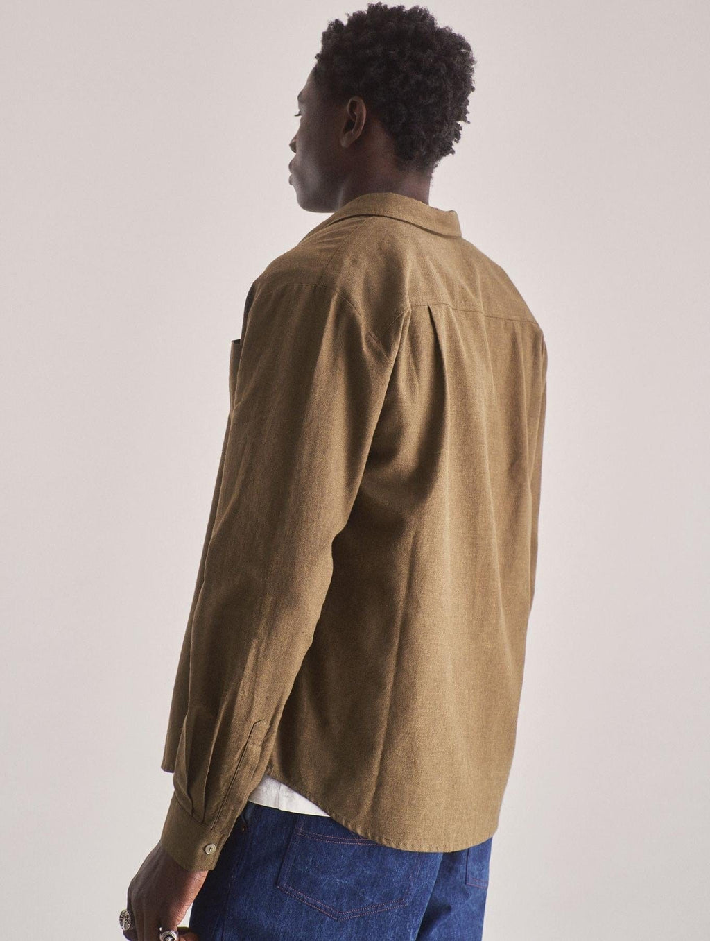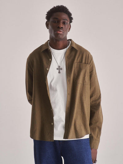 The SPECTRE Organic Cotton Shirt in Green. Made from 100% organic cotton with a soft brushed flannel finish, this oversized, loose-fit shirt offers breathable warmth and gentle feel. Ethically produced in a SEDEX-audited, vegan factory, it features durable branded corozo buttons for lasting style. Perfect for those who value both comfort and responsible fashion.