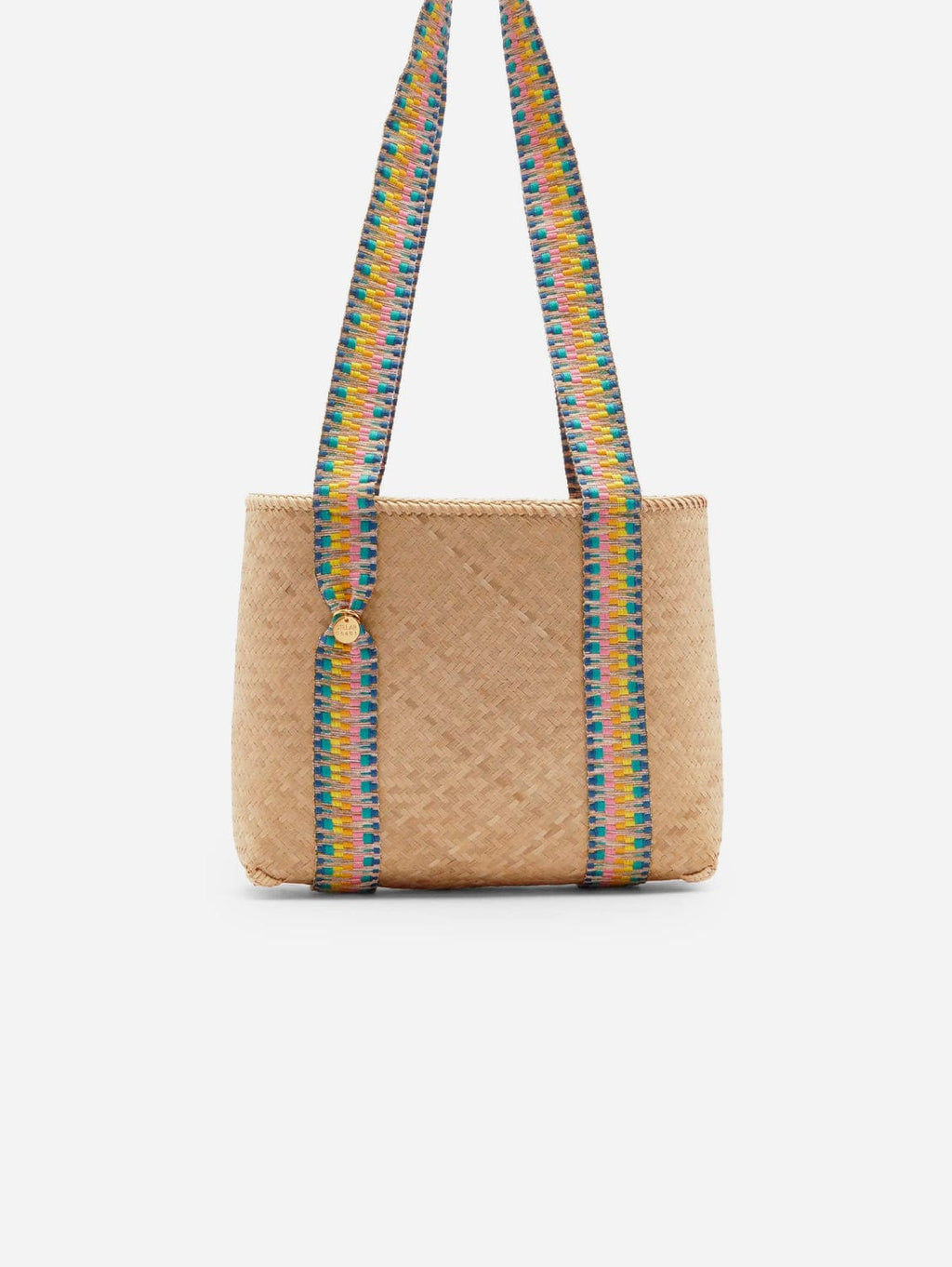 Handwoven with locally grown organic bamboo, it is offset with cotton jacquard straps and yellow gold tone hardware.