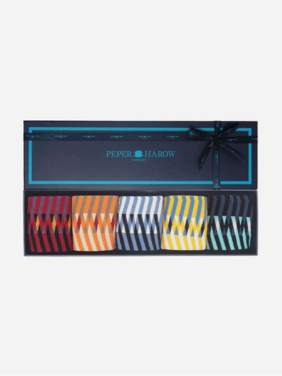 Presenting the Symmetry Gift Box: a luxurious selection of Peper Harow socks in bold red, orange, blue, yellow, and black shades. Crafted from GOTS-certified organic cotton, each pair balances quality and style, ensuring comfort and a seamless finish for any occasion.