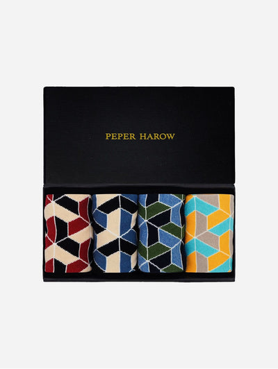 Presenting the Symmetry Gift Box: a luxurious selection of Peper Harow socks in bold red, orange, blue, yellow, and black shades. Crafted from GOTS-certified organic cotton, each pair balances quality and style, ensuring comfort and a seamless finish for any occasion.