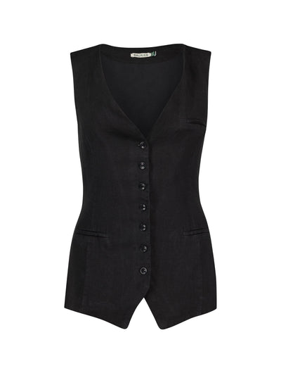 Baukjen loves the versatility and styling potential of waistcoats! Tallulah in premium linen is longer in length than other styles, and cut so that you can wear it as a top on its own, or layer it over tees. A classic piece of tailoring in black, style it with the matching Regina Linen Trousers for a top-to-toe linen look.