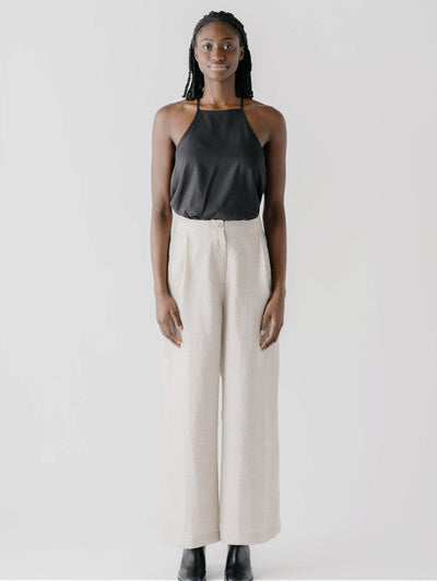The Tangier Trousers are designed with a defined high waist and full length wide legs, making them comfortable and airy. They have deep front pleats for additional width, a hidden waistband for a clean look, and pockets that blend into the design. The back features patch pockets and decorative seams that end in vent details. They feature an eco-friendly button and the top stitching design details make them more durable.