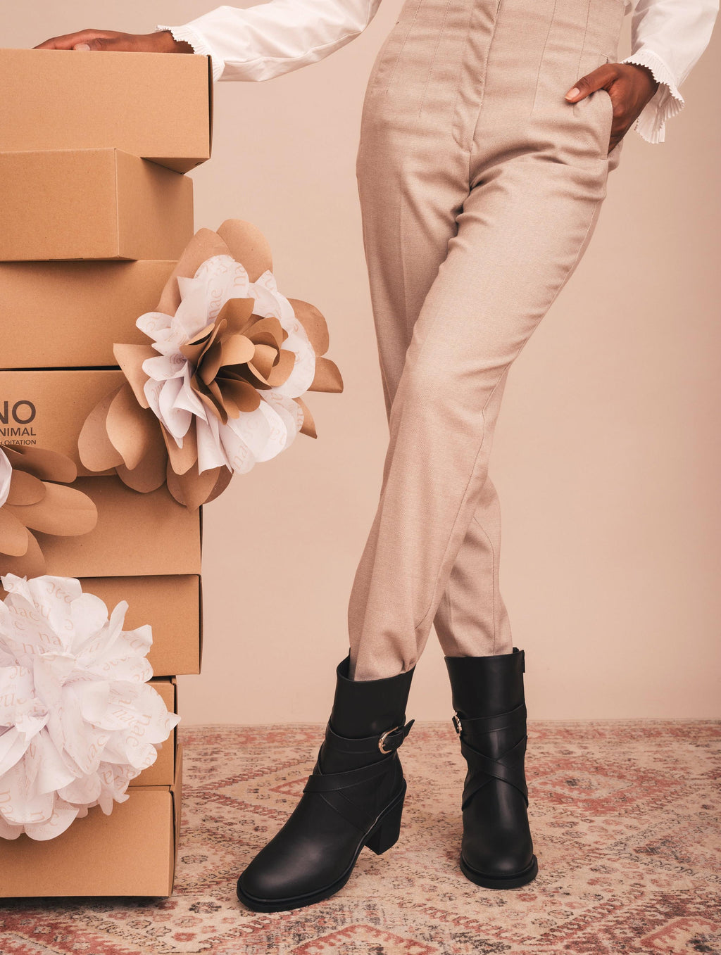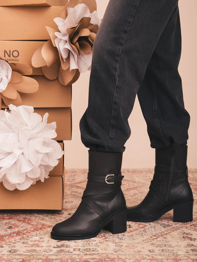 Tulai is a mid-calf women's vegan boot with a block heel, side zip, and decorative strap detail. Crafted in Portugal using OnMicro Pure and lined with OnSteam, it balances bold styling with comfort and ethical materials. Designed for everyday wear with a fashion-forward edge.