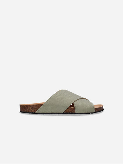 Tupai Green vegan sandals feature a bold criss-cross design crafted from Piñatex, with straps measuring 5.5 cm (2.17 inches) wide. The anatomically shaped cork insole provides exceptional comfort, while the durable sole, made from recycled tires, ensures eco-friendly durability. These sandals are perfect for conscious fashion enthusiasts seeking a stylish yet sustainable option.
