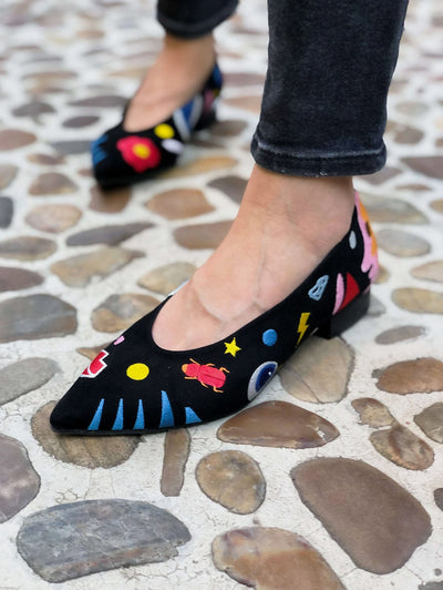 In "A New Universe", I wanted to capture the essence and energy that characterize me as an Abstract Artist and Designer. With them, I seek to evoke and transport their owner to a magical world full of light, color, and love through abstract forms. In this pair, I included many symbols, such as the scarab (to represent resilience and transformation in life), the double 8 (my seal, which represents abundance and inner power) the lightning bolt (the light that we all carry inside), the lips, hearts and the poppy (to remind us that all we need is Love), a pyrite stone (to attract luck and money) and finally the stars, the faces, the eyes, and the galaxy herself so as not to forget that "we are all one" and that we are connected, more than we can imagine."
