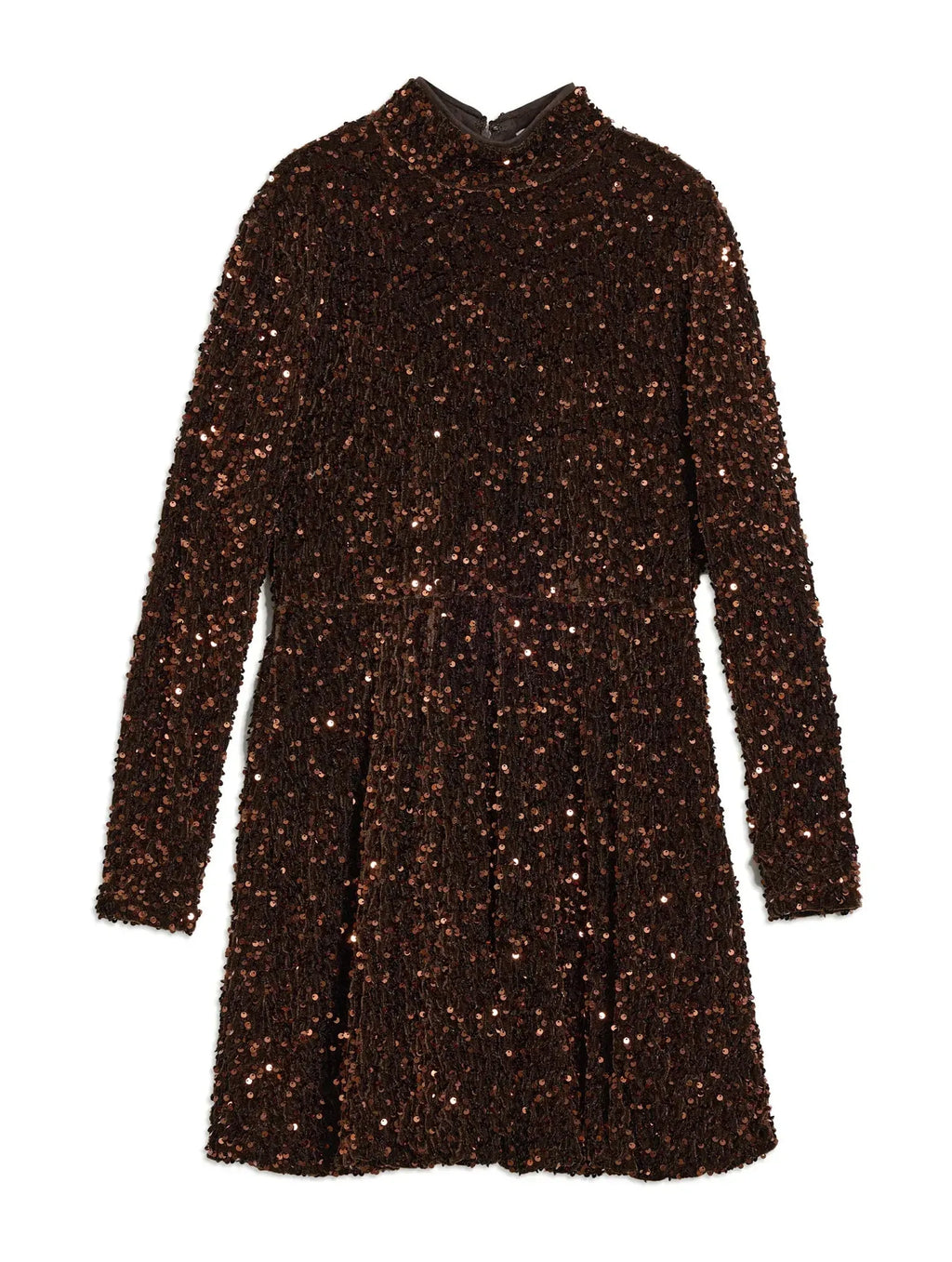 This Velvet & Sequin Puff Ball Short Dress combines luxurious stretch velvet with shimmering bronze sequins for a stunning effect. The elegant funnel neck adds a touch of sophistication, while the playful bubble hem creates a flattering silhouette that moves beautifully. Designed to offer both comfort and style, this dress is perfect for special occasions where you want to feel confident and stylish.