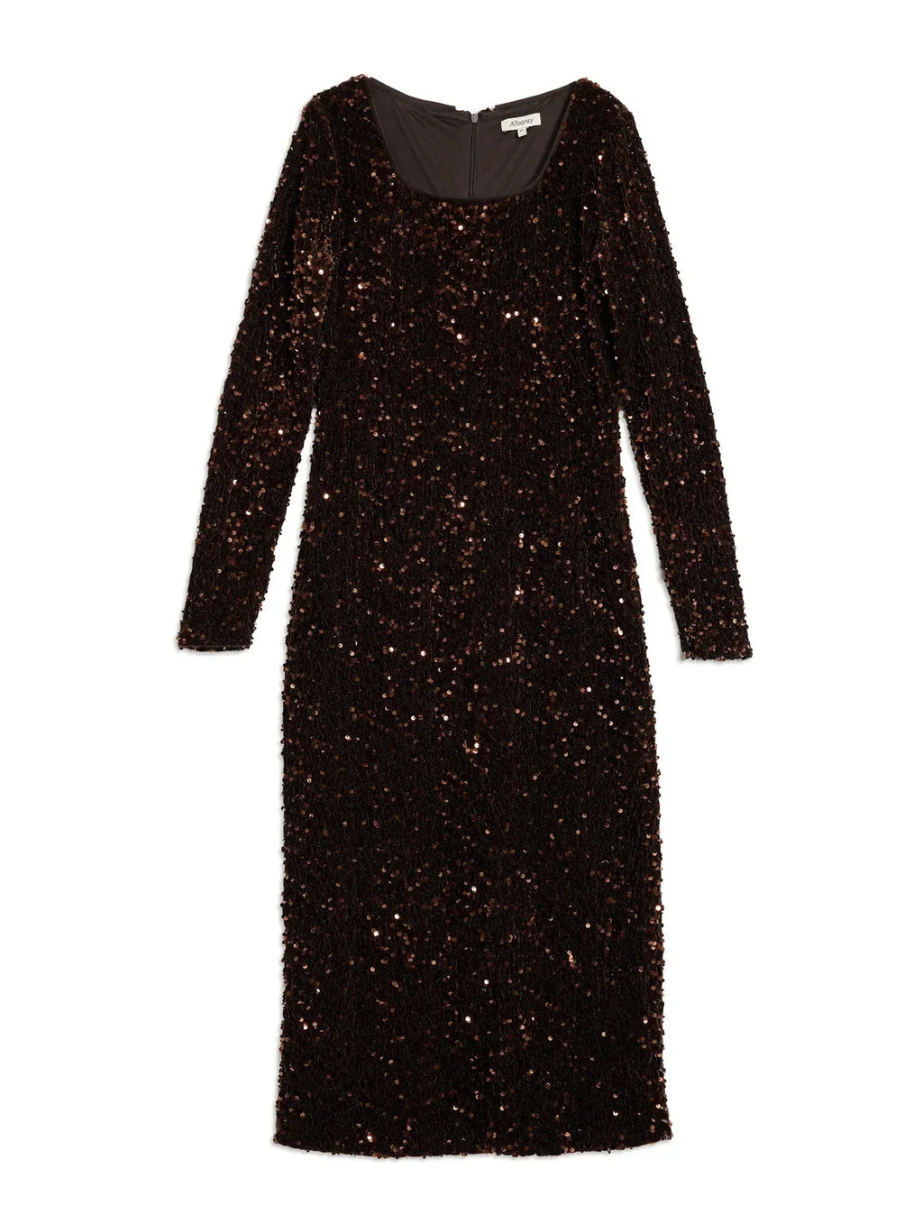 This Velvet & Sequin Midi Dress combines luxurious stretch velvet with shimmering bronze sequins for an elegant look. Designed with a flattering square neckline, the fitted midi length enhances your natural silhouette. Its elongated design adds sophistication, making it perfect for special occasions where you want to feel confident and graceful. Comfortable yet striking, this dress supports your style with both comfort and glamour.