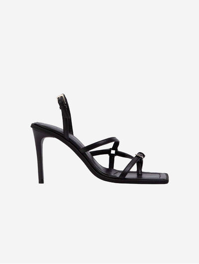 The four-strip high heels with metal buckles. The sharp-edged toe cap adds a contemporary touch to the classic high-heel design. The blunt square adjustment buckle on the front strap ensures a snug fit.