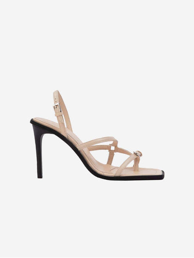 The four-strip high heels with metal buckles. The sharp-edged toe cap adds a contemporary touch to the classic high-heel design. The blunt square adjustment buckle on the front strap ensures a snug fit.