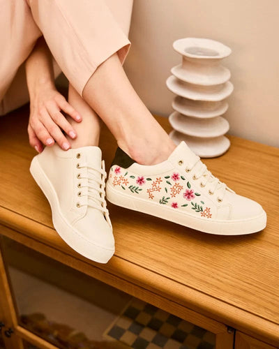 - Recycled white soles with floral motif
